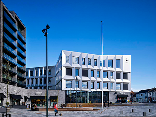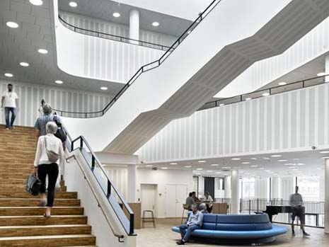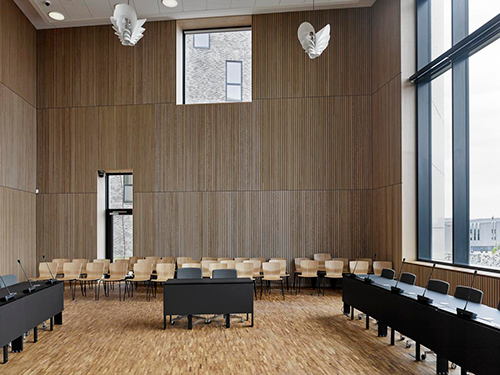 Der er tænkt bæredygtighed ind i alle led; gulvene er lavet af resttræ, køling er mekanisk med strøm fra solceller på taget, inventar, vægge og lofter er støjdæmpende, overskudsvarmen bliver til fjernvarme til byens huse, madaffaldet i kantinen bliver til naturgas. Og bygningen fungerer samtidig som kulturhus med plads til bl.a. koncerter, når medarbejdere og politikere går hjem.”