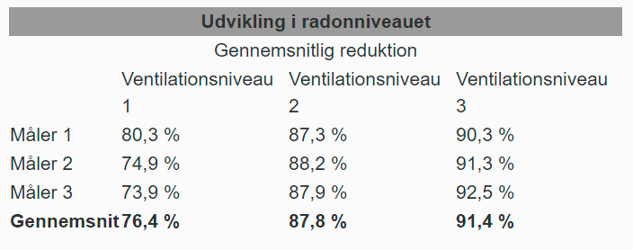 Til sidst kørte løsningen i 6 dage med den højeste hastighed niveau 3 og resultatet blev, at radonniveauet faldt med gennemsnitligt 91 %.
