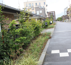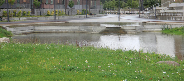Der findes ingen afvandingsriste i IrmaByen. Vandet langs vejene ledes nemlig fra fortove, veje og parkeringspladser til den permeable belægning: IBF Rima, som har en underbyggende drænstabil, hvilket får vandet til langsomt at sive ned til regnvandssystemerne. Idéen er at håndtere og forsinke vandet, der hvor vandet falder. Vandet fra de mange regnvandsbede og permeable belægninger, ledes hen til den store sø ved det store grønne areal, som i øvrigt er skabt med tanke for biodiversiteten - i form af vilde bede. Med Kaffetårnet i horisonten, er der her skabt et unikt og enestående sted for byens beboere, som i øvrigt har fået en fremtidssikret by, specielt når det handler om vand.