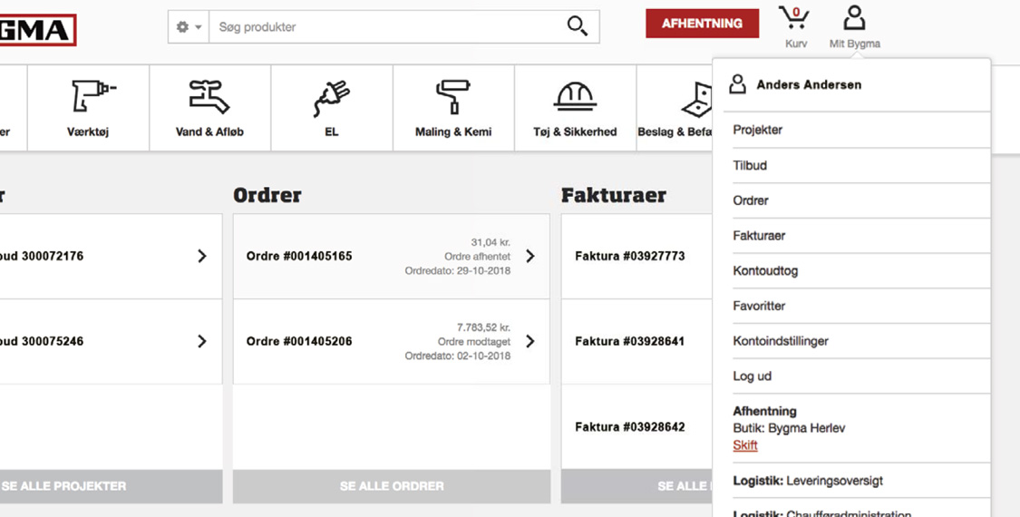 Under Mit Bygma finder du Favoritter. Her kan du gemme de produkter, du ofte køber. På den måde kan du hurtigt finde dem igen.