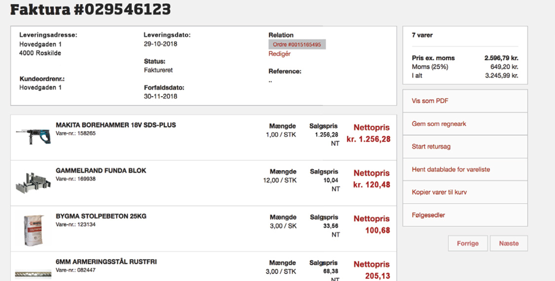 Du kan klikke på de enkelte fakturaer og se detaljer. Du kan også downloade følgesedler og datablade.